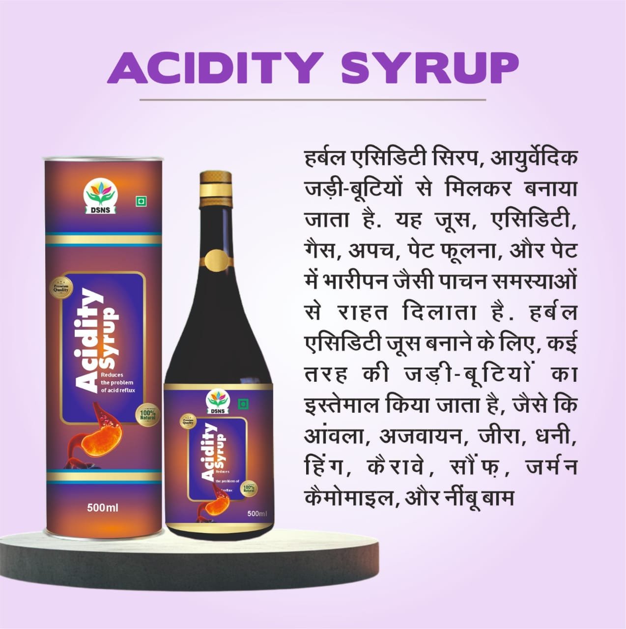 DSNS Acidity Syrup is a gentle herbal formula designed to relieve acidity, acid reflux, gas and bloating.
